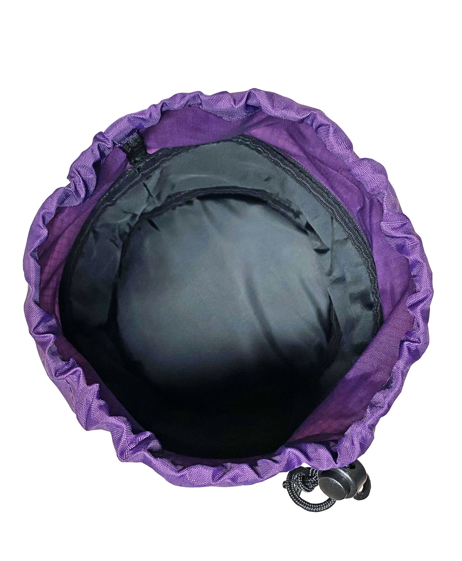 - Drawstring cylinder shape bag design that folds down into a tray for your everyday essentials