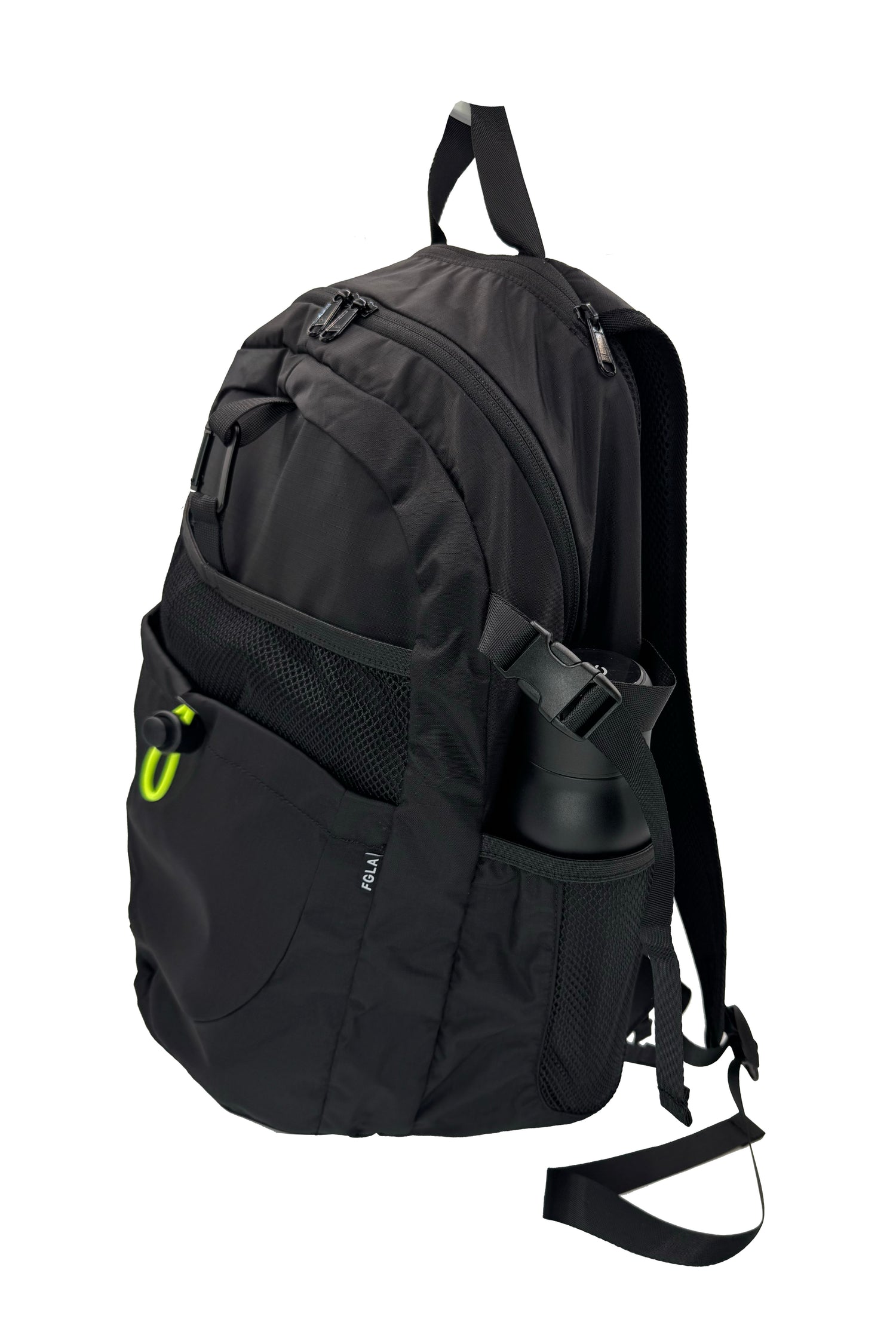 - Outer side water bottle pockets with securing straps